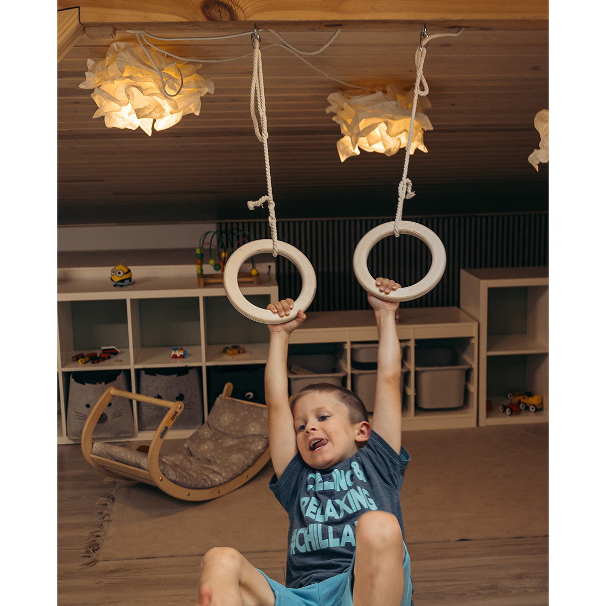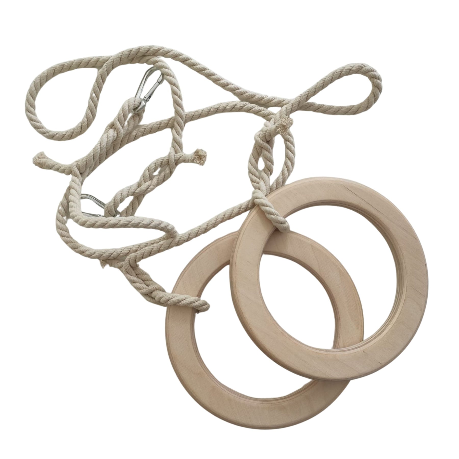 Handgefertigte Holz-Turnringe mit Baumwollseil, die Bewegung, Spielspaß und Abwechslung direkt ins Zuhause bringen.